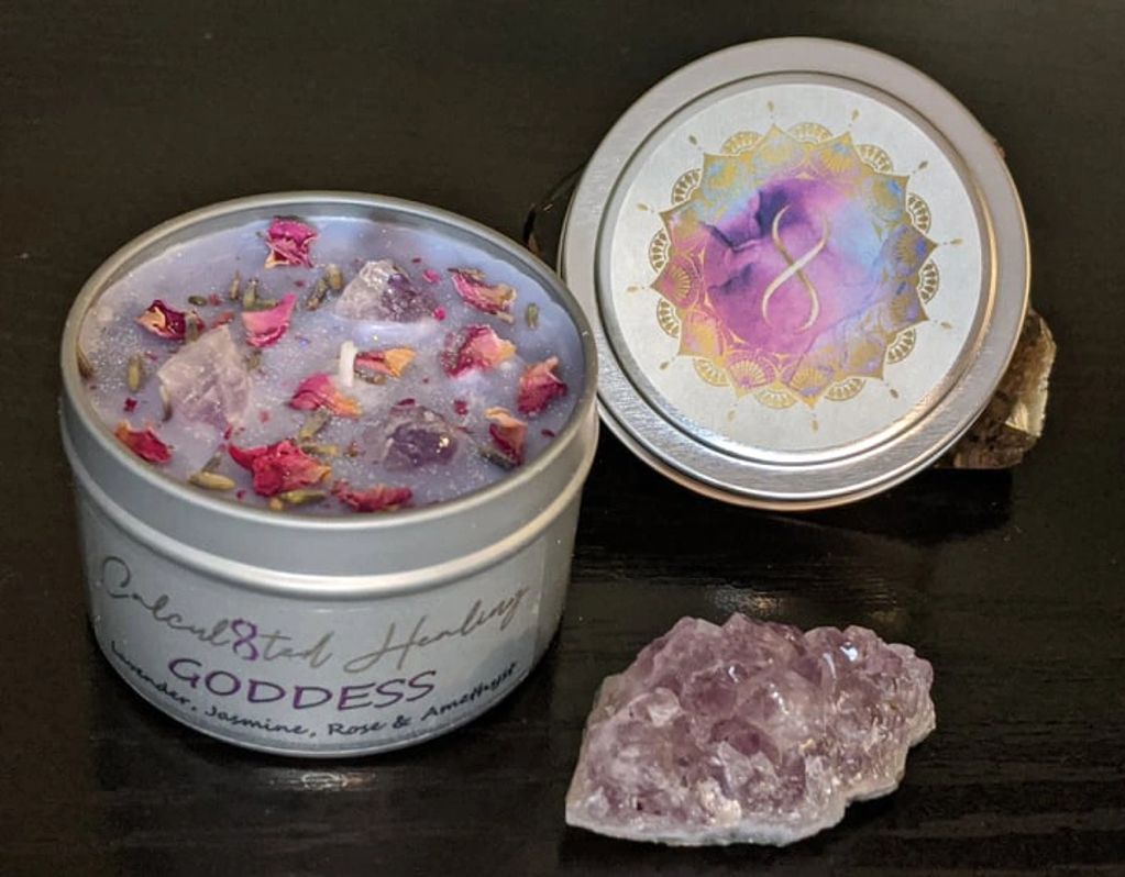 Lavender, Rose and Jasmine with Amethyst crystals and Pink Rose Pedals. Infused with Reiki Healing Energy.